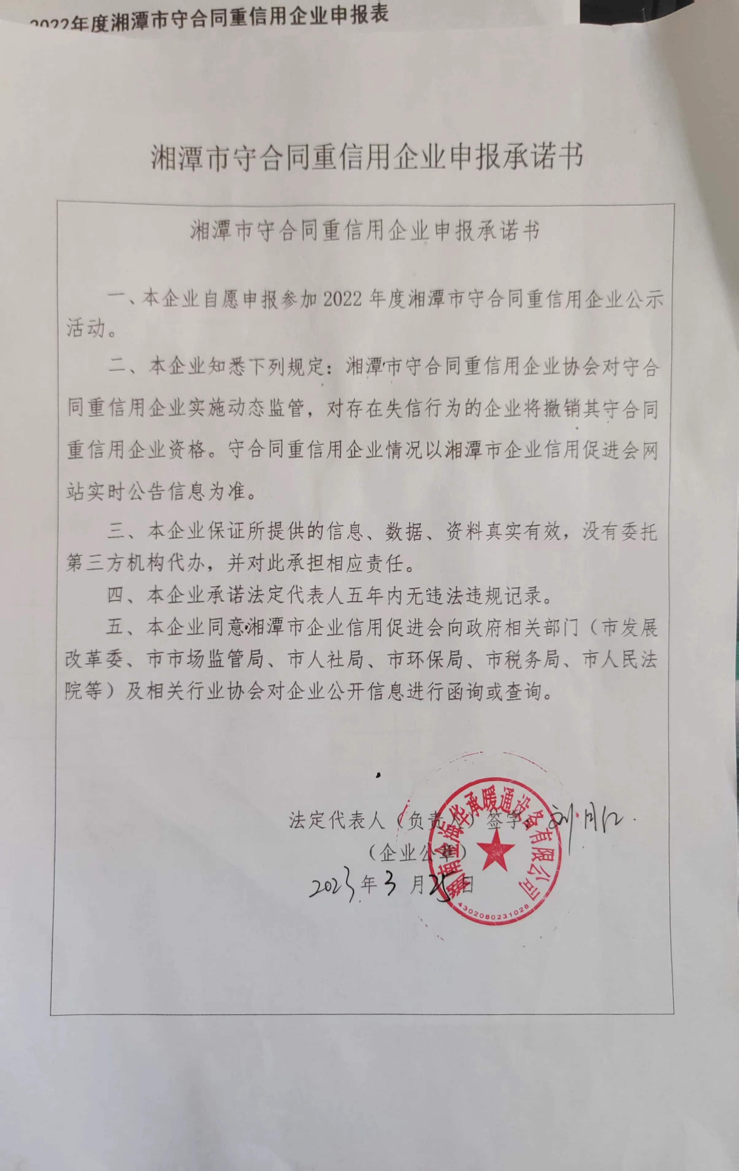 本企業(yè)根據(jù)《湘潭市守合同重信用企業(yè)申報(bào)規(guī)定》等編制 2022 年度企業(yè)信用報(bào)告書,并保證本報(bào)告書內(nèi)容真實(shí)、準(zhǔn)確、完整。