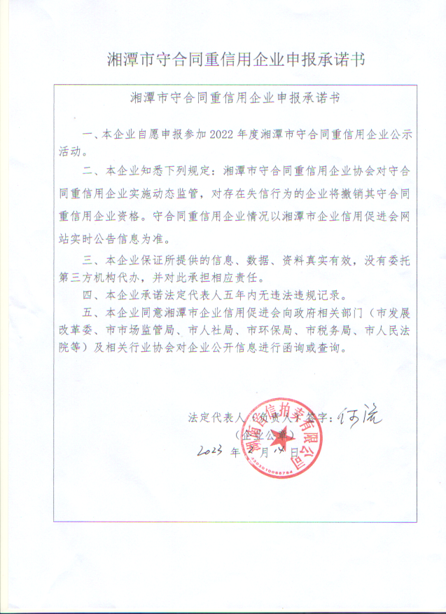 本企業(yè)根據(jù)《湘潭市守合同重信用企業(yè)申報規(guī)定》等編制 2022 年度企業(yè)信用報告書,并保證本報告書內容真實、準確、完整。