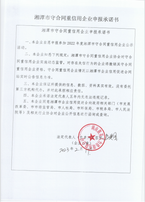 本企業(yè)根據(jù)《湘潭市守合同重信用企業(yè)申報規(guī)定》等編制 2022 年度企業(yè)信用報告書,并保證本報告書內(nèi)容真實、準(zhǔn)確、完整。
