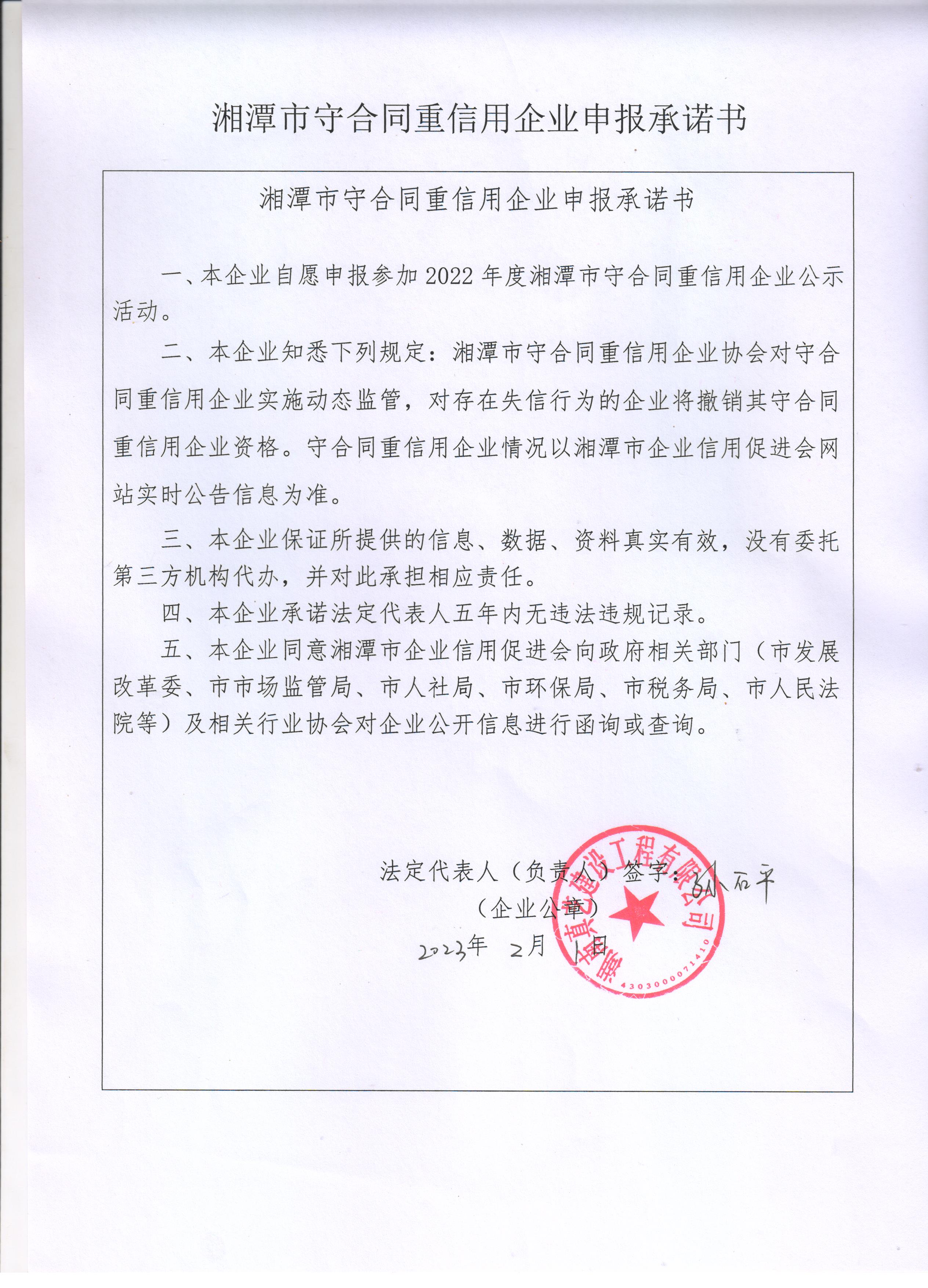 本企業(yè)根據(jù)《湘潭市守合同重信用企業(yè)申報規(guī)定》等編制 2022 年度企業(yè)信用報告書,并保證本報告書內(nèi)容真實、準確、完整。