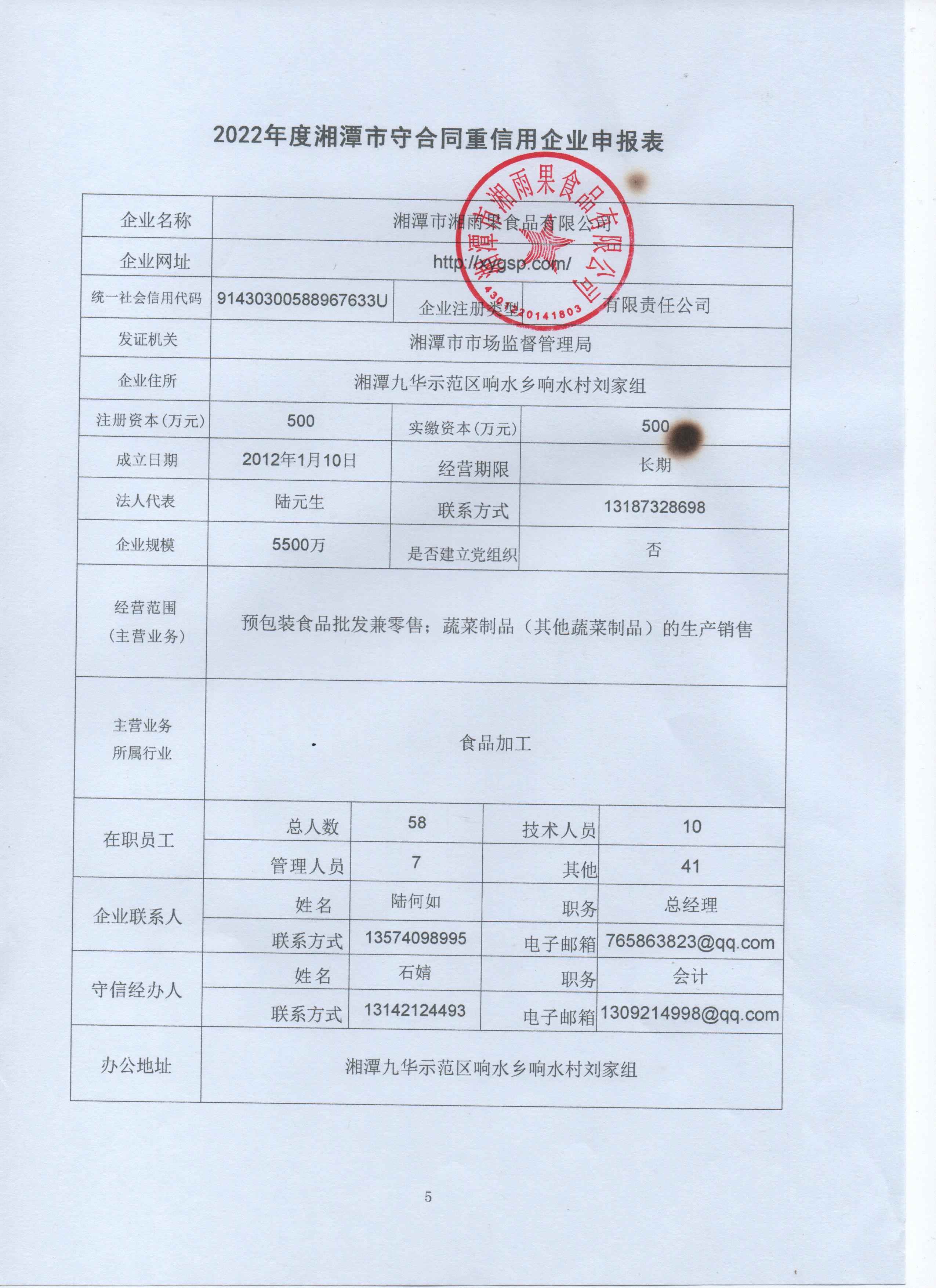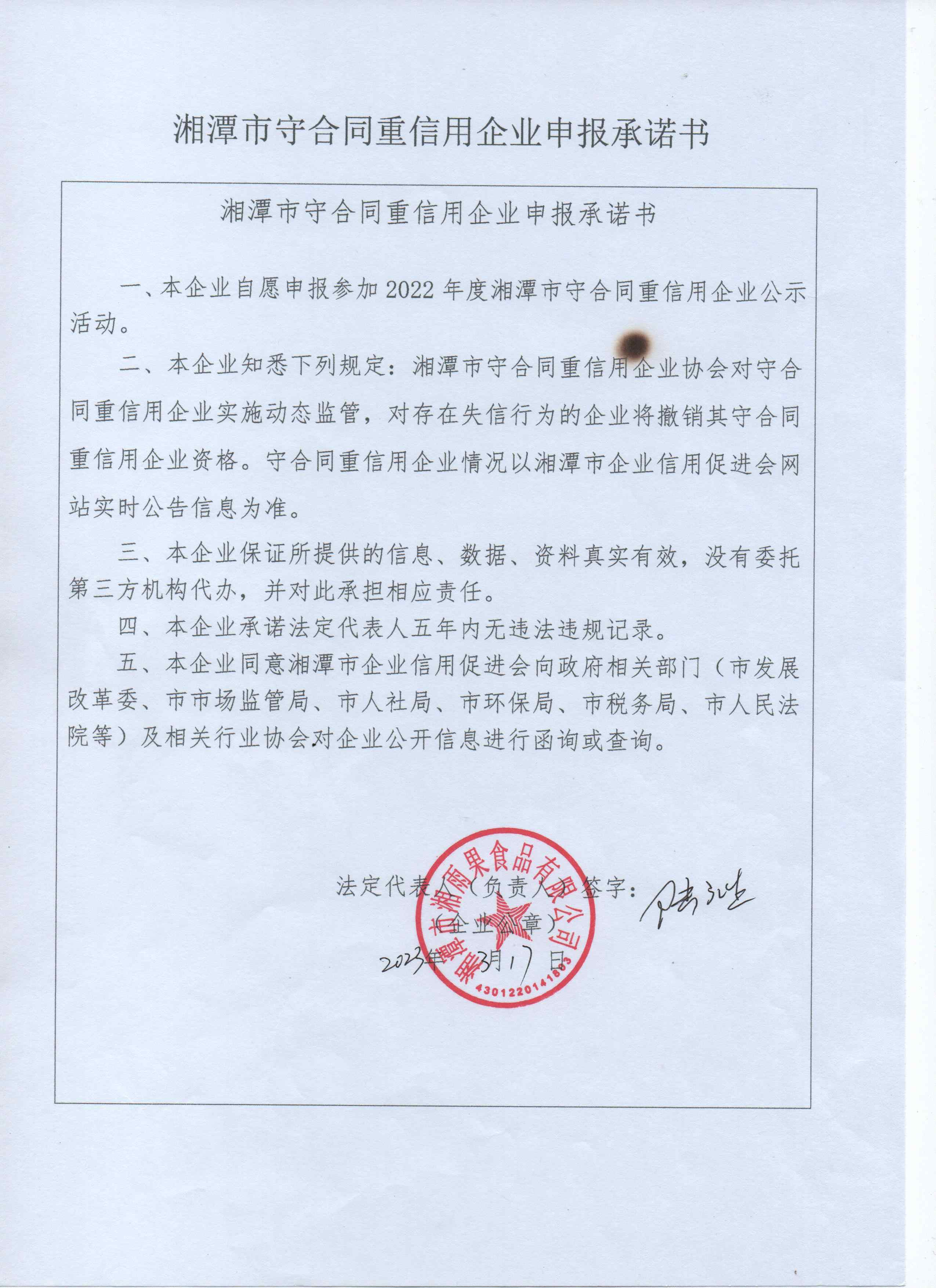 本企業(yè)根據《湘潭市守合同重信用企業(yè)申報規(guī)定》等編制 2022 年度企業(yè)信用報告書,并保證本報告書內容真實、準確、完整。