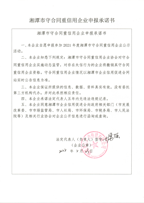 本企業(yè)根據(jù)《湘潭市守合同重信用企業(yè)申報(bào)規(guī)定》等編制 2021 年度企業(yè)信用報(bào)告書(shū),并保證本報(bào)告書(shū)內(nèi)容真實(shí)、準(zhǔn)確、完整。