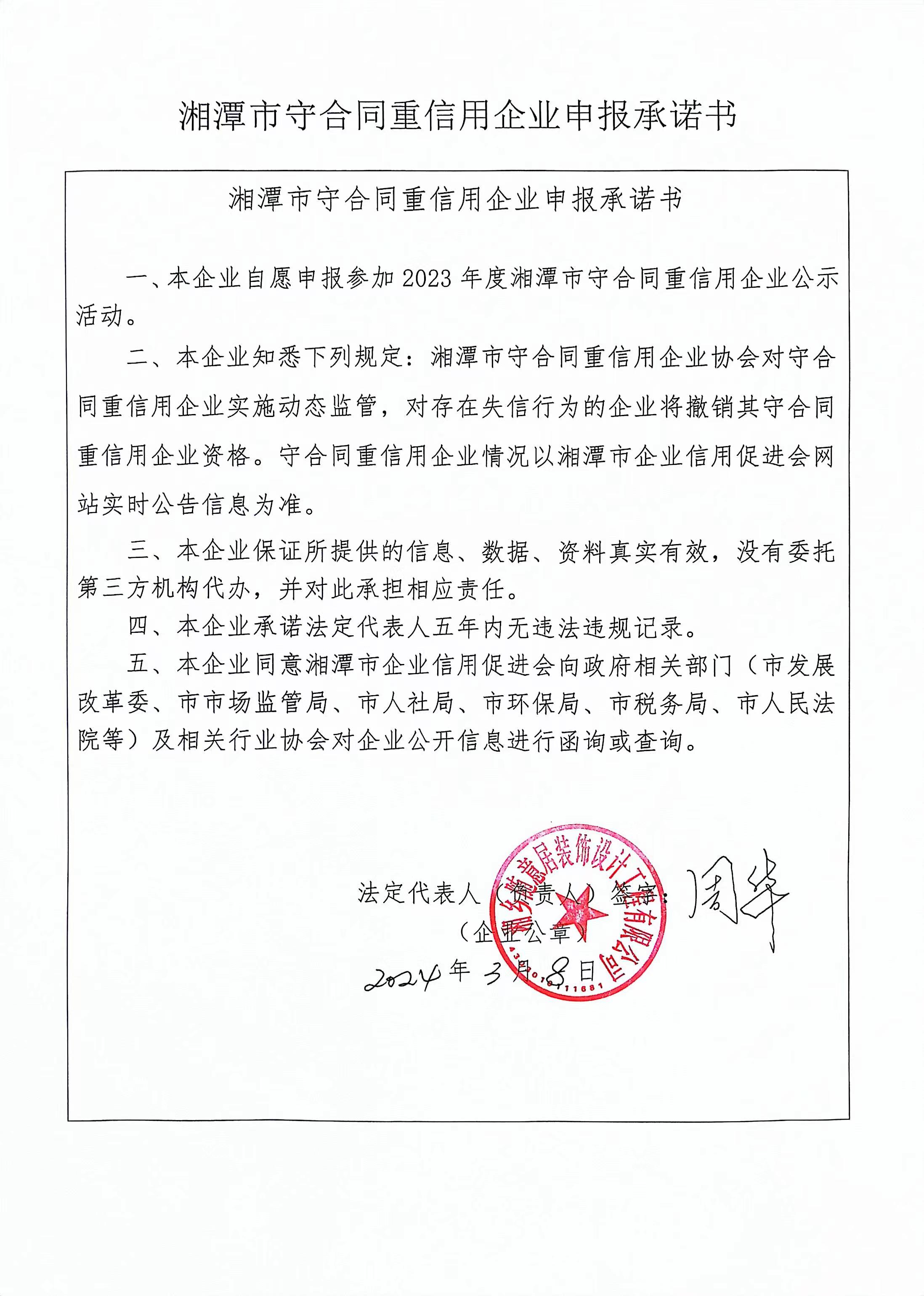 本企業(yè)根據(jù)《湘潭市守合同重信用企業(yè)申報規(guī)定》等編制 2023 年度企業(yè)信用報告書,并保證本報告書內(nèi)容真實、準確、完整。